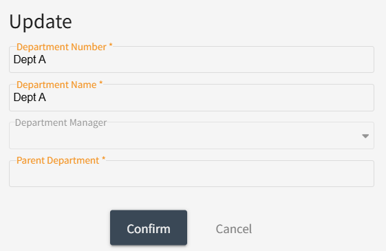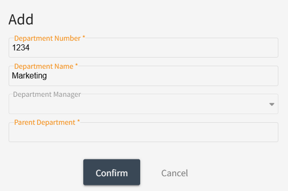 Fill out mandatory information ( * ) , select Parent Department then click [Confirm] to save.