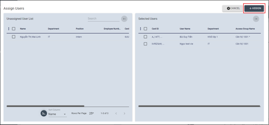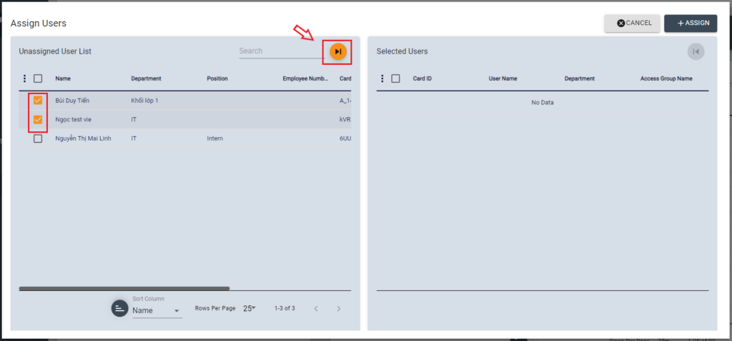 Click Transfer icon to move selected Users to the right and check the list is correct, then click [+ASSIGN] button