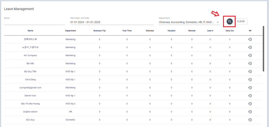 In Leave management menu, you can see all employees’ Leave(Business trip, vacation, sick leave etc.) records. Select Person, Period or Department then click the Search icon to see the record.