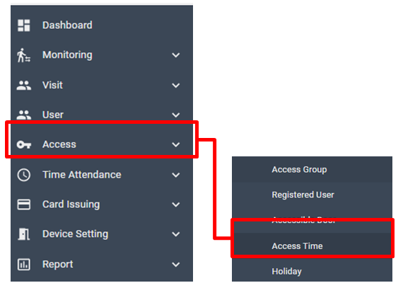 Manager can customize Access Time in this menu. It is also capable to manage Access Time. It defines accessible time and door open time (physically).