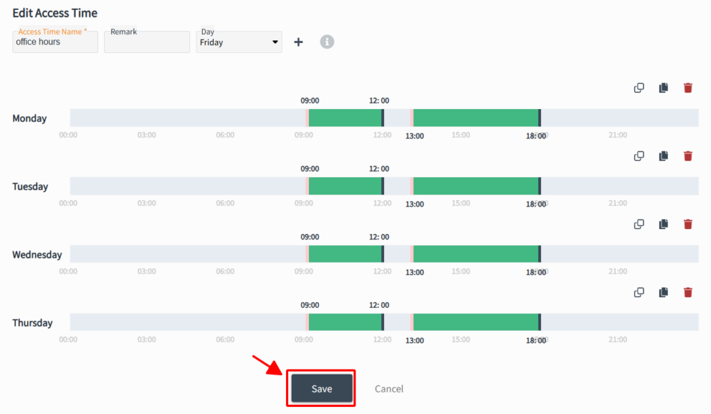 In the Access Time menu, you can define different conditions by the days of the week.