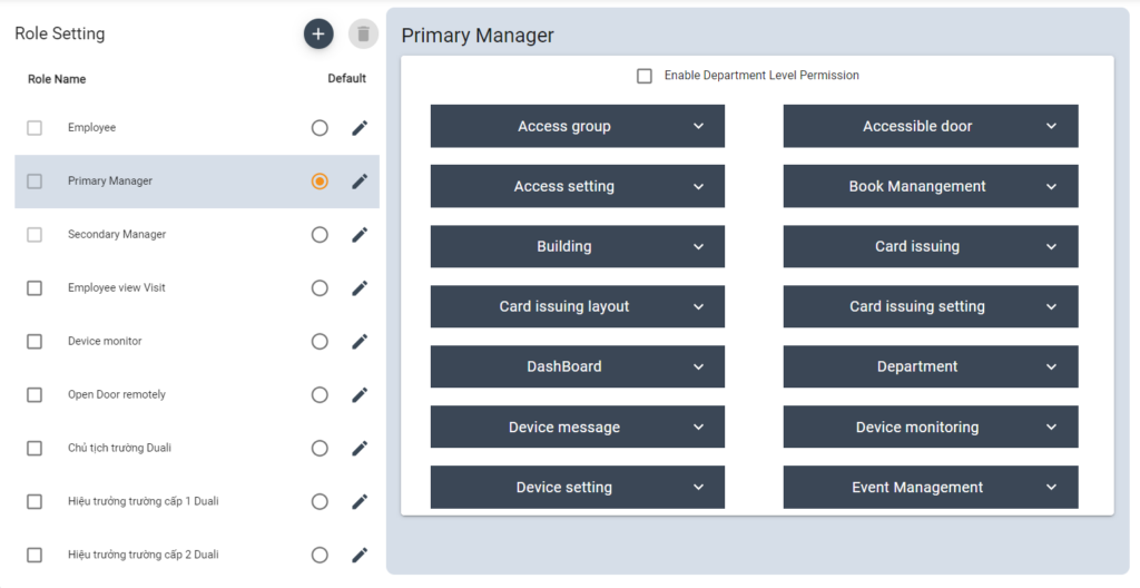 Primary Manager – has all authority to view/add/edit/delete of the whole system