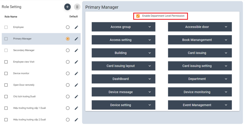 Primary manager has the authority to view/add/edit/delete of his department only.