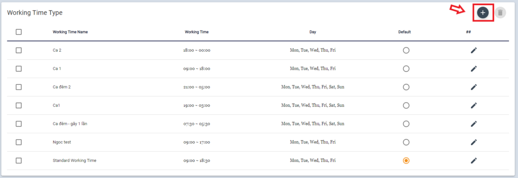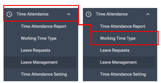 To manage Working time (Shift), move to Time Attendance > Working Time Type menu.